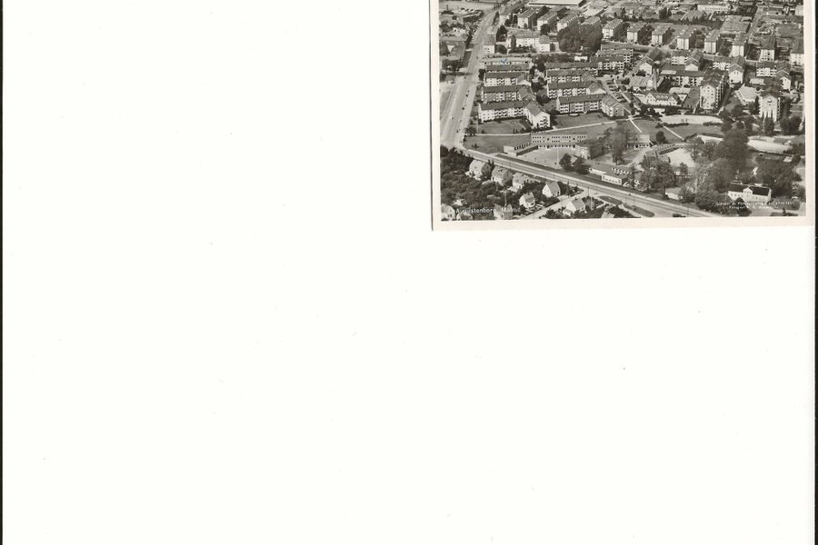 Svartvitt flygfoto över Augustenborg i Malmö. Bilden är daterad 1957 och visar bostadsområdet. Fotot är taget av K. E. Rosenqvist och är godkänt av Försvarsstaben, nummer 3773.