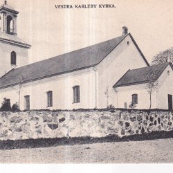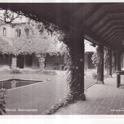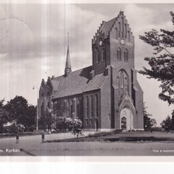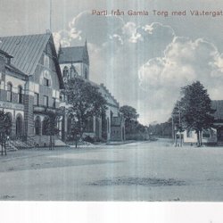 Vykort med bild av ett torg med en ryttarstaty i förgrunden och byggnader i bakgrunden. En av byggnaderna har ett högt torn med en svensk flagga i toppen. Flera personer syns på torget, varav några sitter på bänkar.