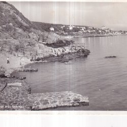 Ett fotografi föreställande en kvarn i Simrishamn. Bilden är i svartvitt och visar kvarnen med sina vingar, omgiven av träd och en inhägnad trädgård. En väg syns i förgrunden. En person står vid kvarnens ingång.