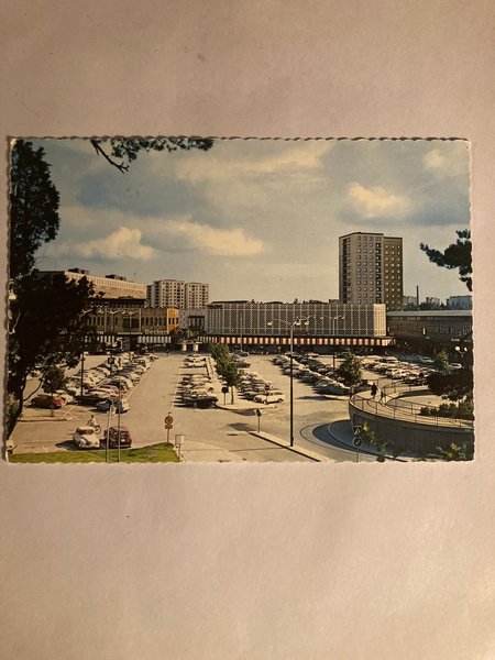 Ett vykort med ett motiv av en stadsmiljö med byggnader och Vykort 10 x 15 cm se bild bra skick