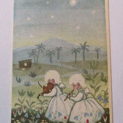 Vykort med julmotiv. Ett vykort visar barn som rider på ett griskind. Ett annat vykort visar en tomte som bär en gris och en korg.