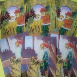 Antal: 6 st, varav 5 exemplar av motiv med tomte och släde samt 1 exemplar av motiv med tomte och vandringsstav.