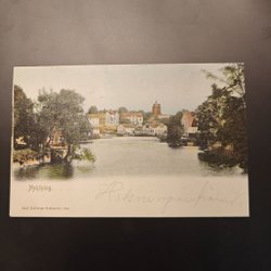 Ett vykort med motiv av en kyrka i ett vinterlandskap. Texten "Glædelig Jul" syns tydligt på framsidan. Vykortet är poststämplat.