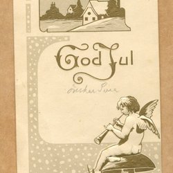 Ett äldre julkort med motiv av en ängel i ett vinterlandskap. Texten lyder: Af himmeln angeln kommer är, Gott budskap han till jorden bär; Med fröjd han bringar detta bud: Född är nu Frälsarn, Herren, Gud.