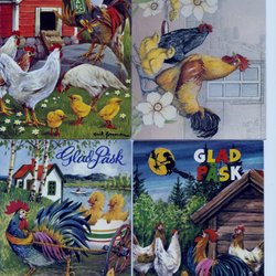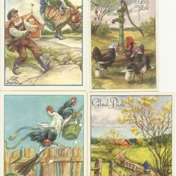Fyra påskkort med motiv av tuppar och höns. Korten är poststämplade och skrivna på.