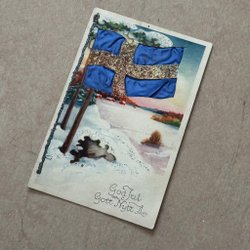Tre julkort med olika motiv. Ett kort föreställer en tomte som tittar till ett sovande barn. Ett annat kort visar en tomte med en ekorre i ett snöigt landskap. Det tredje kortet avbildar en herde med får under en stjärna. Frimärke baksidan