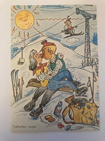 Ett vykort med motiv av ett par i skidbacken. På vykortet syns även en skidlift och texten "Fjälluften suger".