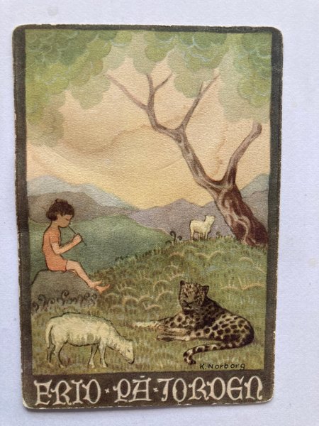 med ett motiv av ett barn, ett får och en leopard i ett landskap.