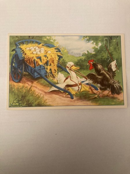 Ett vykort med en illustration av en anka som drar en vagn full med ägg, medan en tupp står bredvid.