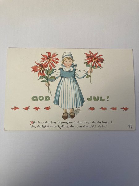Ett julkort med en illustration av en flicka som håller julstjärnor. På kortet står det "God Jul!" och en vers om julstjärnor.