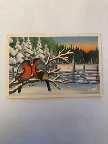 Ett vykort med motiv av två fåglar i ett vinterlandskap.
