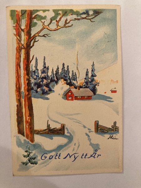Ett vykort med vintermotiv. På kortet syns ett rött hus i ett snöigt landskap med träd och staket. Texten "Gott Nytt År" är tryckt på kortet.