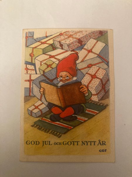 Ett julkort med en tomte som läser en bok omgiven av julklappar. På kortet står det "God Jul och Gott Nytt År".