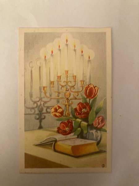 Ett vackert vykort med motiv av ljusstake, tulpaner och en bok.