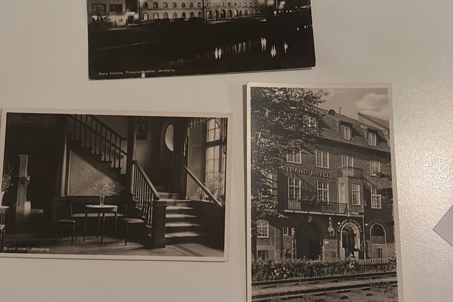 Tre gamla vykort från Jönköping. Vykorten visar Stora Hotellet Frimurar hotellet , postgånget 1/1 1936. 2 kort på Strand hotell , foto K Björlingson (ej Postgångna)