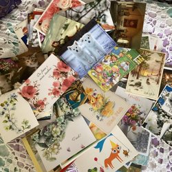 Ett sortiment av blandade kort med olika motiv och lite kuvär