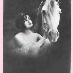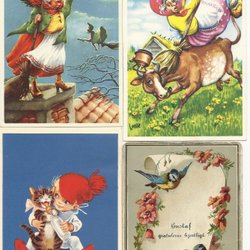 Ett gammalt vykort med en pojke och en hund. På kortet står det "Jag Gratulerar!". Adressat är Hanna Karlsson och Lina Noring, Hellvadsheden. Guld/relif