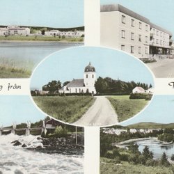 Ett vykort som visar en vy från Kempeby med Domsjöverken i bakgrunden. Vykortet är stämplat 11.7.53.