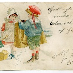 Ett vykort med ett motiv av ett barn med en trumpet och hatt.