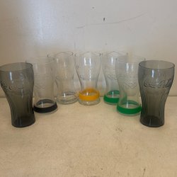 Sex stycken dricksglas med Coca-Cola tryck. De högre glasen har en höjd på 17 cm. Diameter upptill 6 cm. Det lägre glaset har en höjd på ca 12 cm. Diameter upptill ca 6 cm.