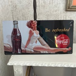 En dekorativ plåtskylt med Coca-Cola motiv. Perfekt för samlaren eller som en retro detalj i hemmet.