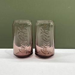 Ett glas med Coca-Cola-logotypen präglad på sidan. Glaset har en lila nyans.