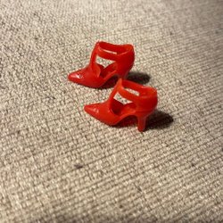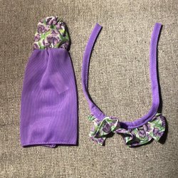 Skipper docka märkt Mattel Inc 1967 Philippines. Dockan har blont hår och blå ögon. Hon bär en orange topp med blå detaljer och en vit kjol.