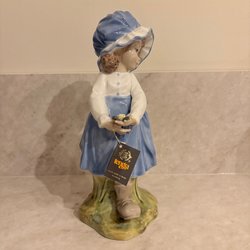 En vacker porslinsdocka med blont lockigt hår och en detaljerad klänning i blått och vitt med spetsdetaljer och rosetter. Perfekt för samlare eller som en dekorativ inredningsdetalj.