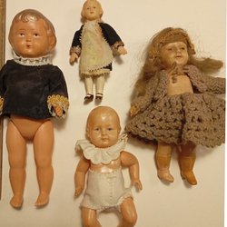 Ett set med 5st tyska miniatyrdockor i celloid märkta med Germany 4/3 placerade i en liten korg Dockorna ca5 cm har klänningar i olika färger och matchande rosetter i håret. Korgen är dekorerad med spets