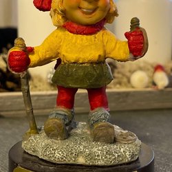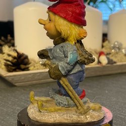 Söt porslinsdocka med blont hår i flätor. Hon har en grön klänning med ett vitt förkläde. Perfekt för samlare eller som en dekorativ detalj. 19 cm hög