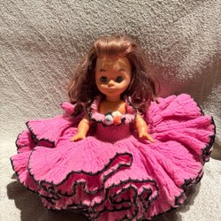 En vacker porslinsdocka med lockigt hår och en detaljerad klänning. Dockan är 53 cm hög. Perfekt för samlare eller som en dekorativ detalj.