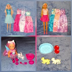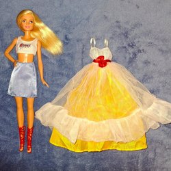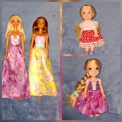 En söt porcellinsdocka med långt brunt hår och en röd-vit rutig klänning. Dockan har vita skor. Den är ca 40 cm hög.