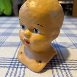 Ett dockhuvud i plast med blå ögon och blont hår. Märkt med en symbol och siffran 8.