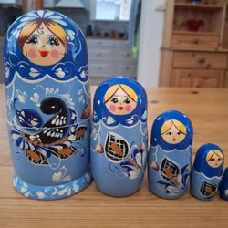 Dockan består av flera delar som passar in i varandra i klassisk matrjosjka-form. Samtliga dockor som hör till setet finns med (den minsta har vält på fotot men finns alltså med). Målade ansikten med karikatyrartade drag, utfört i traditionell stil.