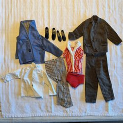 Ken kläder, inkluderar en blå jacka, en rosa jacka, en lila tröja och ett par svarta byxor.