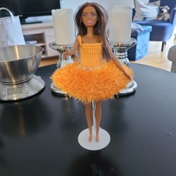 Hon bär en gul stickad klänning med bara axlar och en matchande gul scarf knuten runt halsen.