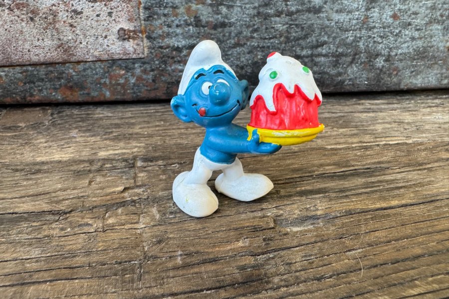 En smurffigur som håller en tårta. Figuren är blå och vit med en röd och vit tårta med gröna detaljer.