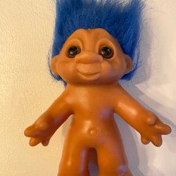 En söt troll docka med färgglatt hår och ett örhänge. Den är märkt "Bright of America INC" och "Made in China" på fötterna.