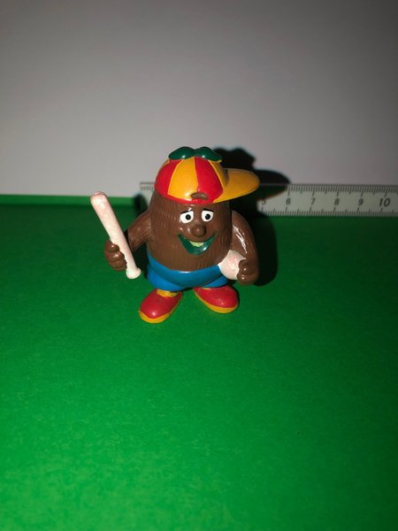 Denne samlefigur forestiller en baseballspiller med en rød og gul kasket, blå shorts og røde sko. Figuren holder et hvidt baseballbat i den ene hånd og en hvid baseball i den anden. Den er lavet af plastik og har en højde på cirka 7 cm.