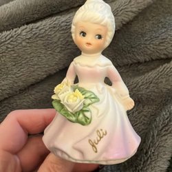 Söt porslinsfigur föreställande en flicka i rosa klänning med en blombukett. Figuren representerar månaden Mars.