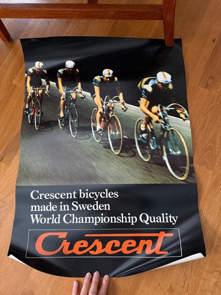 En affisch med Crescent cyklar, tillverkade i Sverige med världsmästerskapskvalitet.