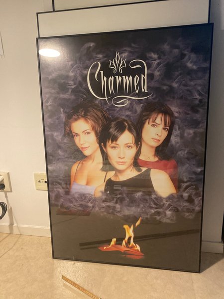 Inramad 60x90 affisch med motiv från Charmed. Föreställer tre kvinnor med texten "Charmed" ovanför och en eldflamma nedtill.