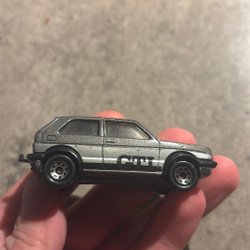 En Matchbox Volkswagen Golf GTI leksaksbil. Den är tillverkad i Thailand och har texten ”Abstract” på sidorna.