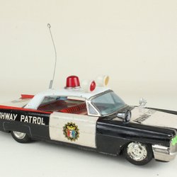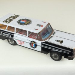 vintage "Highway Patrol" polisbil tillverkad i Japan, troligen någon gång under 1950- eller 1960-talet. Vet ej tillverkaren men tror den är tillverkad av märket Bandai från Japan. Har lite bucklor. Men i övrigt bra skick för sin ålder.
