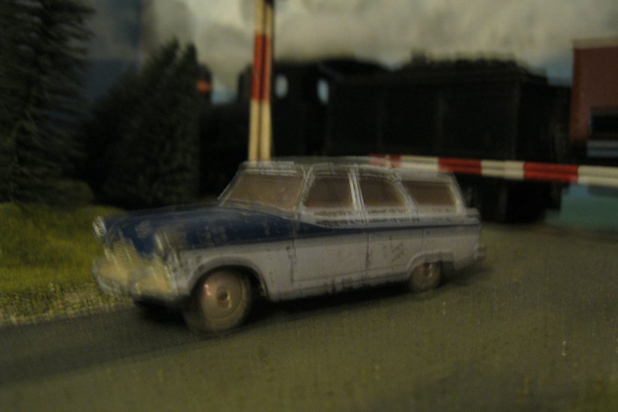 En legetøjsbil af ældre dato. Bilen er en model af en stationcar i farverne blå og hvid.