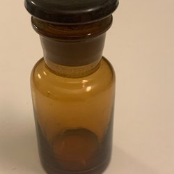 En brun apoteksflaska med tillhörande lock. Märkt med siffrorna 157 på locket och 545 på flaskan.