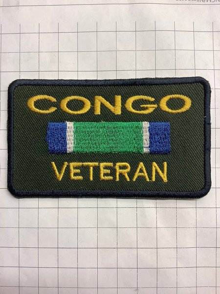 Broderad tygmärke med texten "CONGO VETERAN" i guld och ett färgglatt band i mitten.