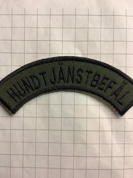 Militär tygmärke med texten "HUNDTJÄNSTBEFÄL" i svart brodyr på en grön botten. Märket är böjt.