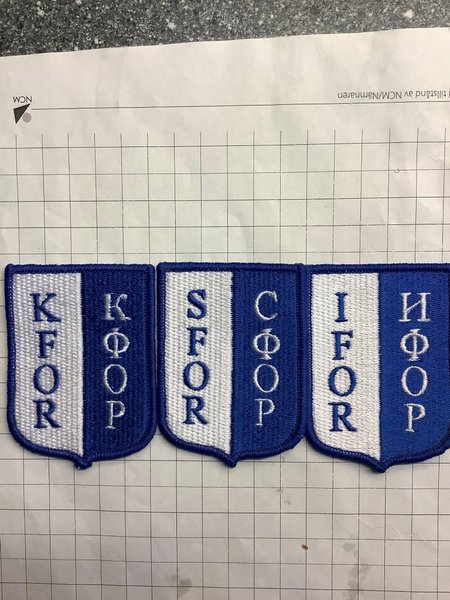 Tre broderade märken med texten KFOR, SFOR och IFOR. Märkena är i blått och vitt.