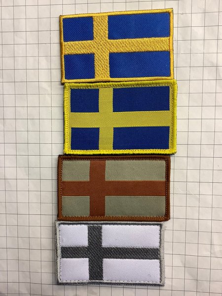 Här är ett set med fyra tygmärken. Två av märkena föreställer den svenska flaggan i blått och gult. Ett märke visar en flagga med ett brunt kors på en beige bakgrund. Det sista märket har ett svart kors på en vit bakgrund.
